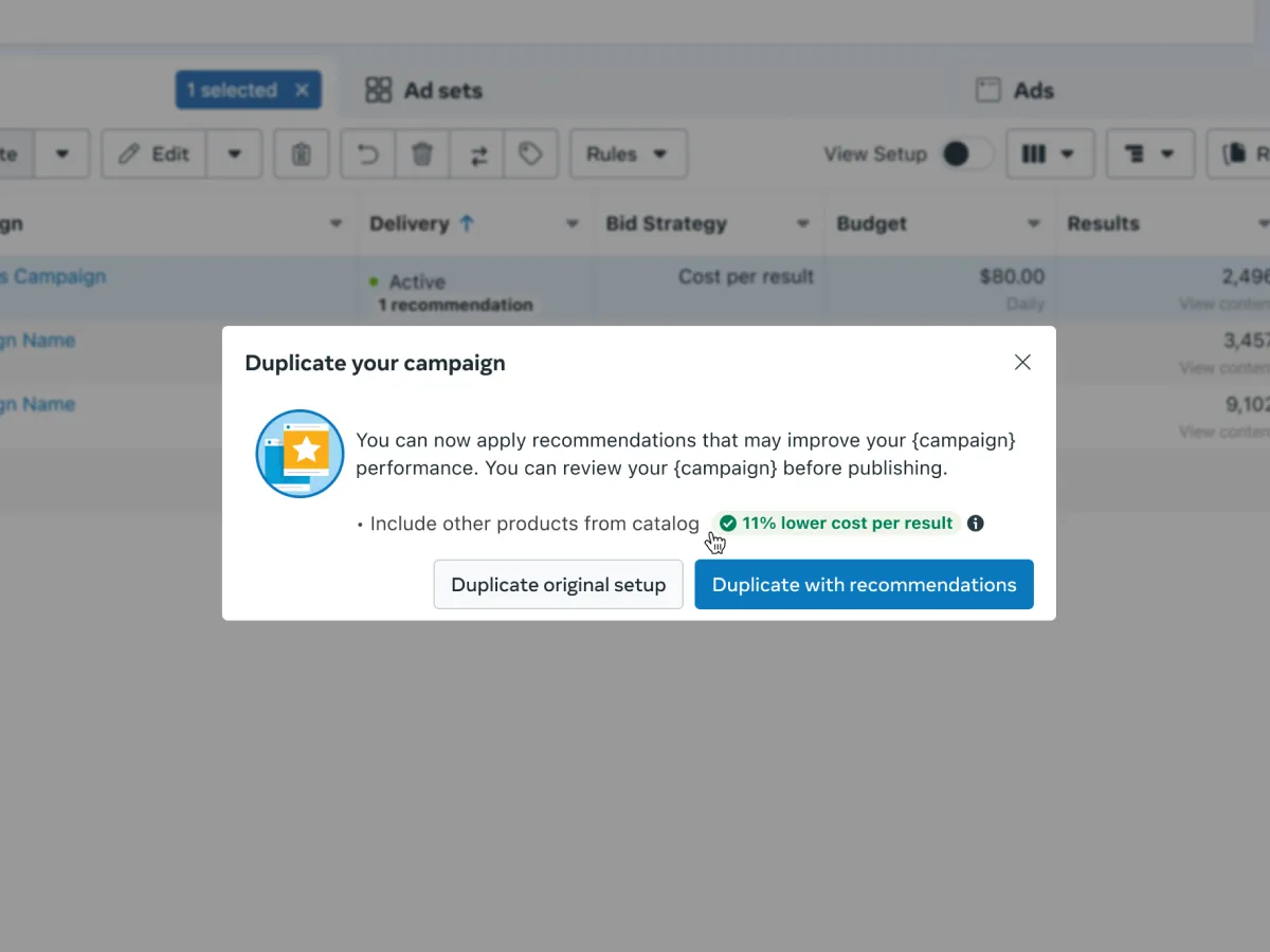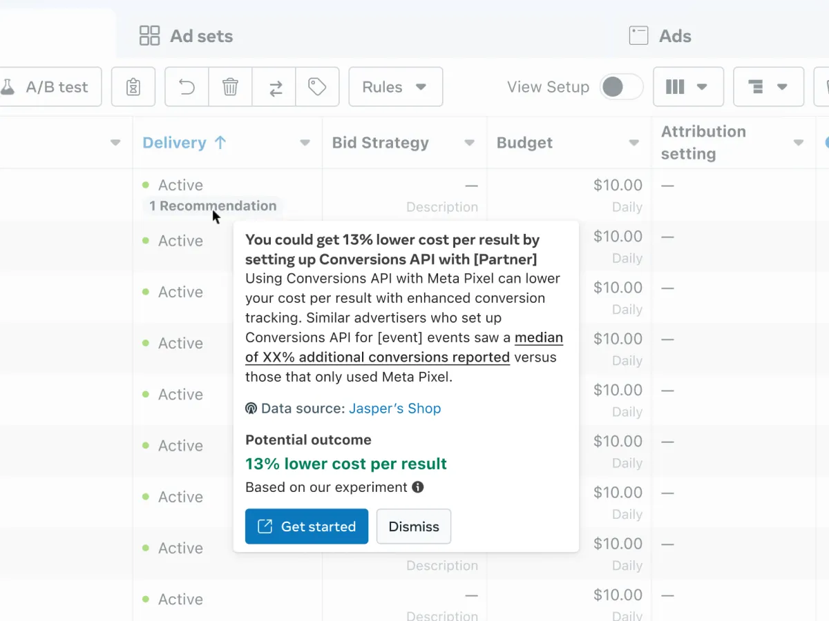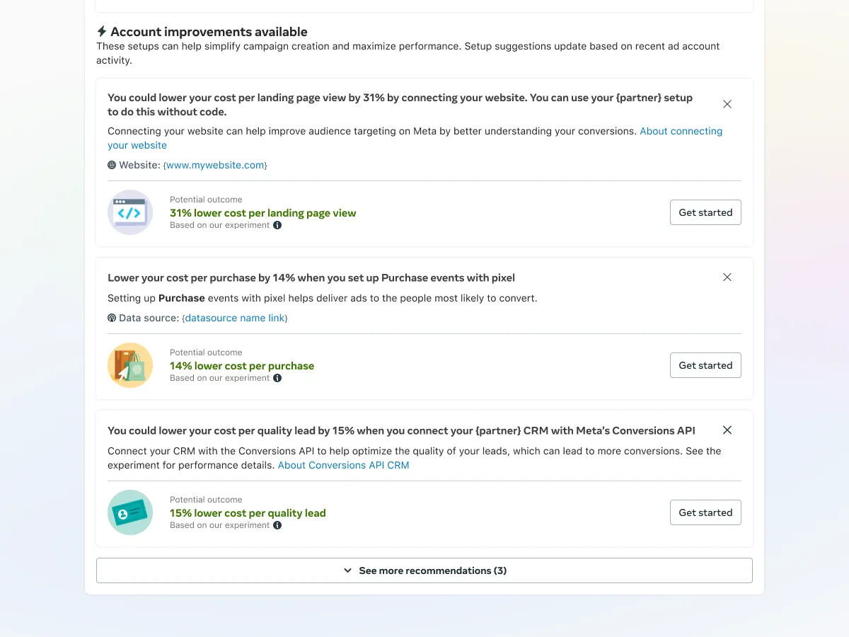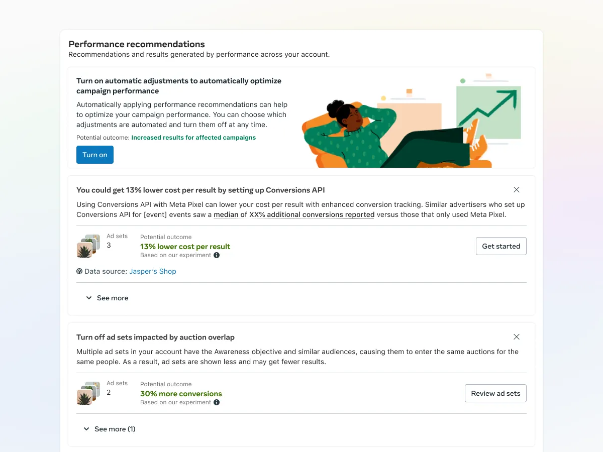 Opportunity Score changed that. A single 0–100 score that tells advertisers how optimized their campaigns are, with personalized recommendations ranked by predicted impact and updated in near real-time. One language across Ads Manager, CRM, and marketing. It launched globally in 2025 — advertisers who adopted recommendations saw a 5% median decrease in cost per result.